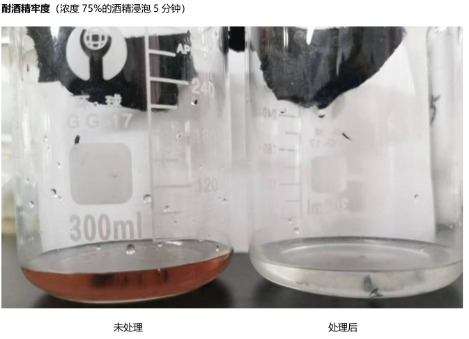 解决方案:处理后的面料,经75%浓度酒精浸泡5分钟不掉色,确保:
