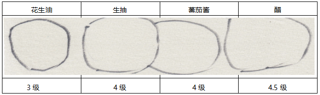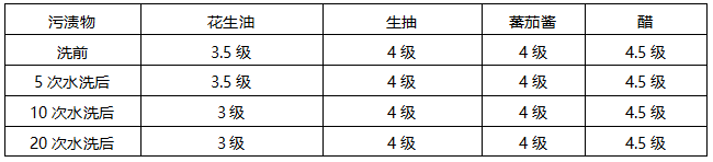 2. 亲水易去污方面花生油去污可达到3.5级,其它三类污渍物达到4-5级。
