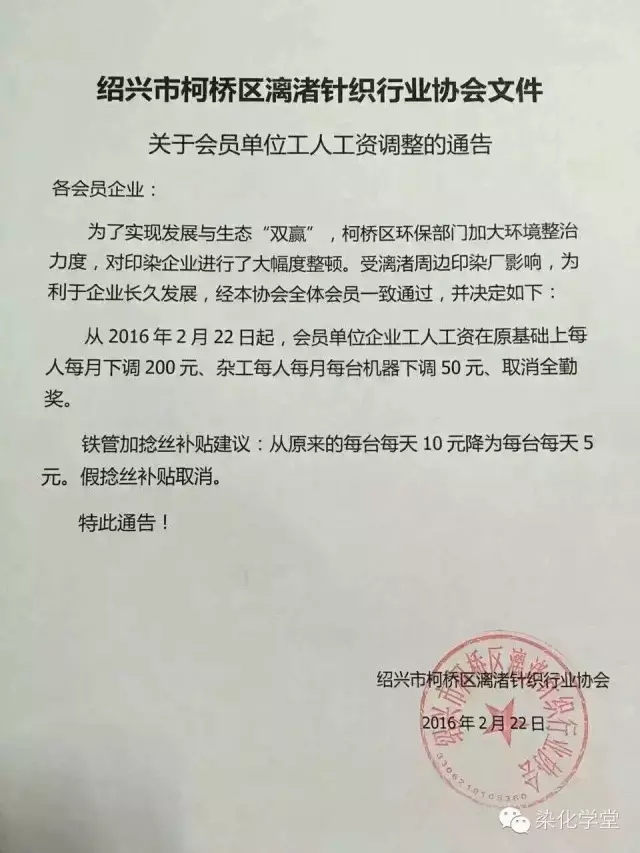 绍兴市柯桥区漓渚镇针织行业协会发布:关于会员单位工人人资调整的通告