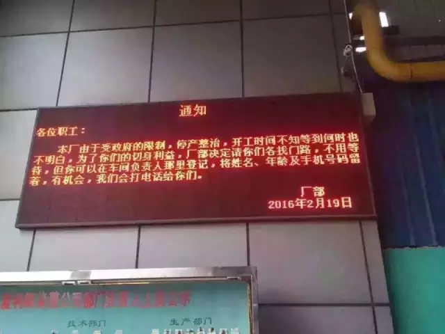 通告内容:本厂由于受政府的限制,停产整治,开工时间不知等到何时也不明白,为了你们的切身利益,厂部决定请你们各找门路,不用等待,但你可以在车间负责人那里登记,将姓名,年龄及手机号码留着,有机会,我们会打电话给你们。
