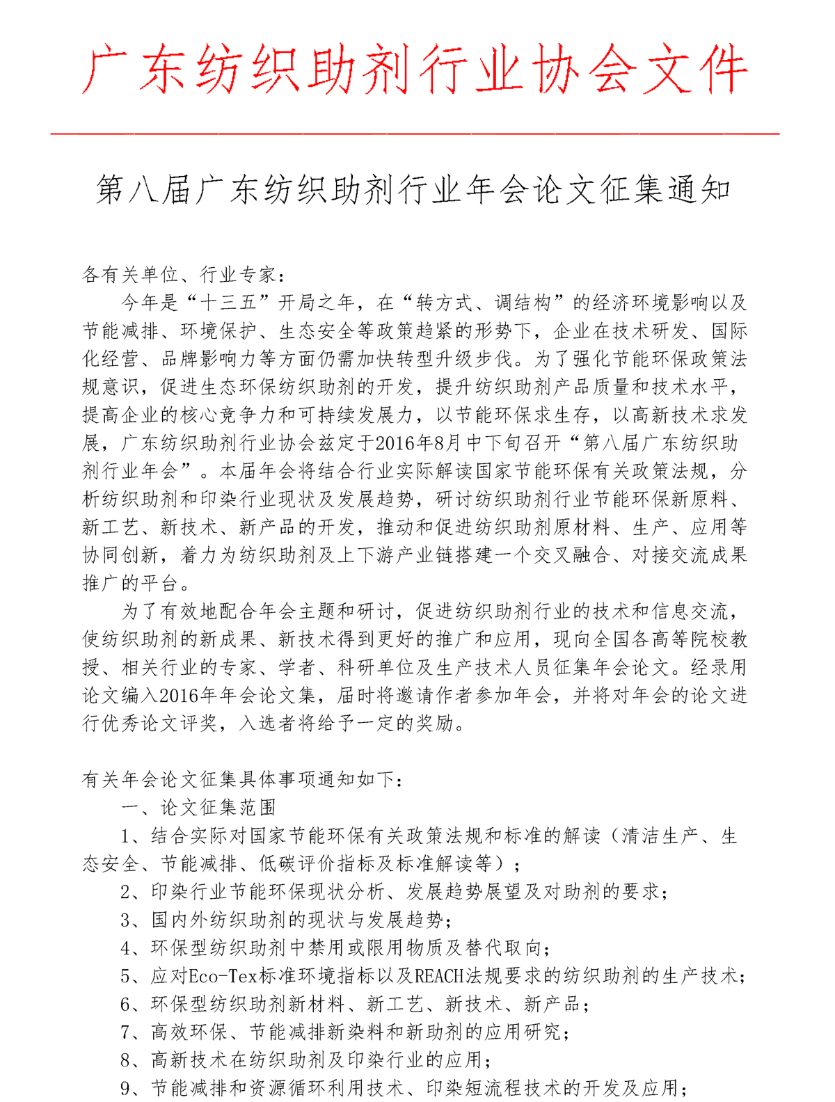 【导读】:广东纺织助剂行业协会兹定于2016年8月中下旬召开“第八届广东纺织助剂行业年会”。本届年会将结合行业实际解读国家节能环保有关政策法规,分析纺织助剂和印染行业现状及发展趋势,研讨纺织助剂行业节能环保新原料、新工艺、新技术、新产品的开发,推动和促进纺织助剂原材料、生产、应用等协同创新,着力为纺织助剂及上下游产业链搭建.....