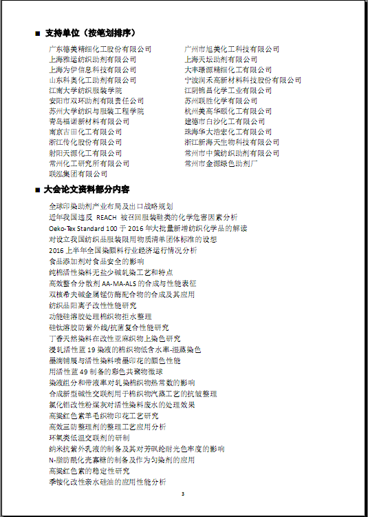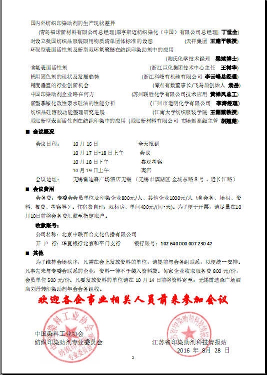 中国染料工业协会纺织印染助剂专业委员会成立以来,每年与江苏省印染助剂情报站联合 召开行业年会,从 2008 年签署合作协议(第 24 届)至今已经举办了 8 届行业年会。在行业内 产生了很大的影响,发挥了积极的作用。根据印染助剂行业未来发展的需要,纺织印染助剂专 委会秘书处自 2016 年 8 月 1 日起办公地址从常州搬迁至上海市共和新路 966 号,与中国染料 工业协会有机颜料专业委员会合署办公。我们将继续与江苏省印染助剂情报站、常州化工研究 所有限公司通力合作,为印染助剂行业的技术交流与合作搭建好平台和桥梁。
