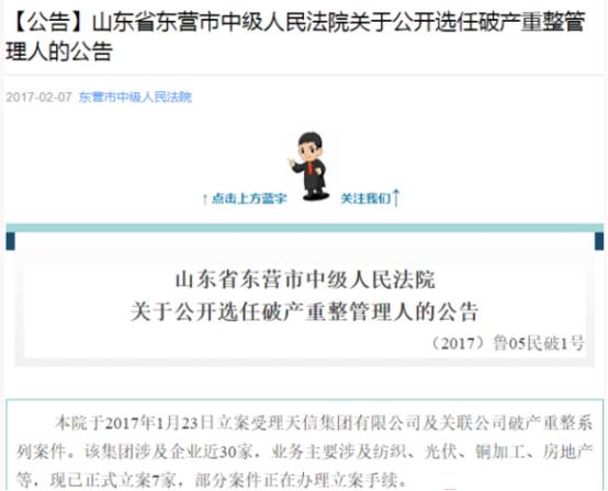 3月16日,东营法院公告显示,天信集团第一次债权人会议将于2017年5月16日下午3时在东营市东营区黄河路36号召开,依法申报债权的债权人为债权人会议的成员,有权参加债权人会议。
