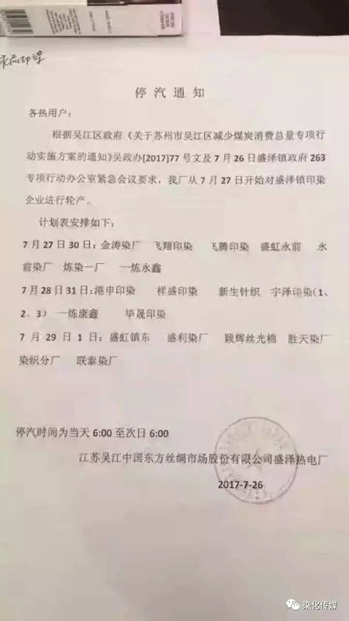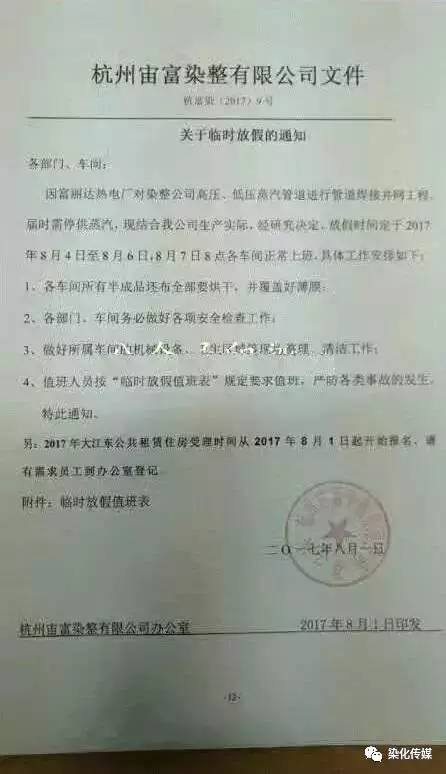 微信印染人了解到,由于杭州瑰丽达热电厂对染整公司高压,低压蒸汽管道进行焊接需求停蒸汽,结合出产实际情况,部分染厂暂时放假。