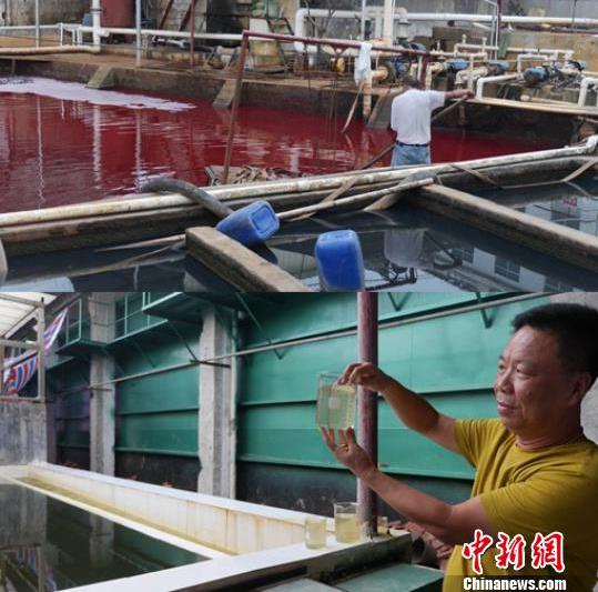 普宁政府引导当地印染企业改进污水处理设施(上图为处理前的工业废水,下图为企业负责人展示处理后的工业废水)。 陈启任 摄