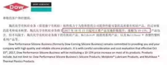 全球有机硅网笔者从道康宁经销商和瓦克官网了解到,道康宁主要有机硅产品实施价格上调,上调幅度为10%-15%,将于10月15日起执行。