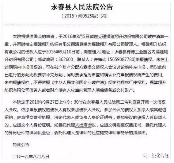 据公开资料显示,翔升纺织和翔运纺织的法定代表人均为施养市。翔运纺织注册的时间正好是在翔升纺织实现超高利润的那一年,或许是公司高层扩大规模,获取更多利益而为。然而,好景不长,据永春县人民法院发出的公告显示,该纺企已于2016年破产。