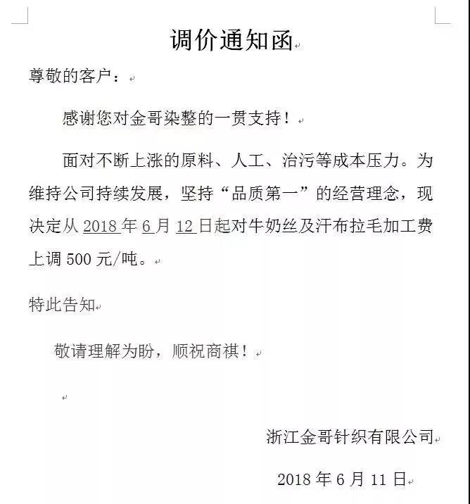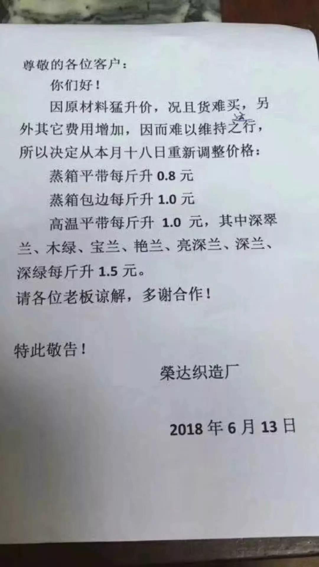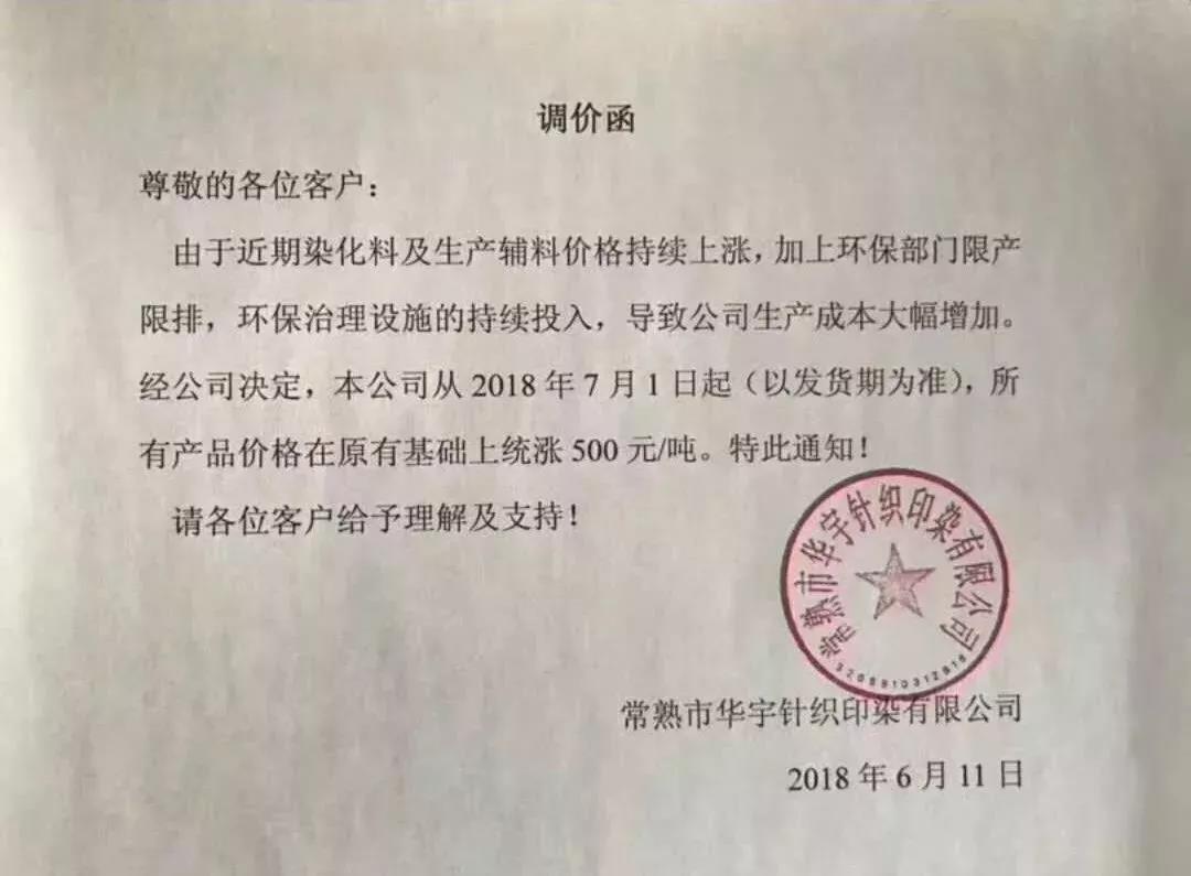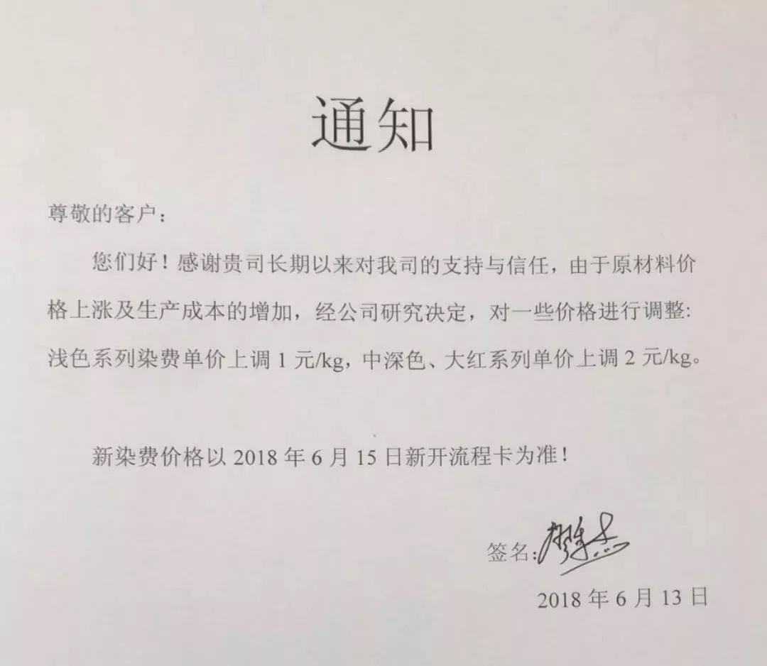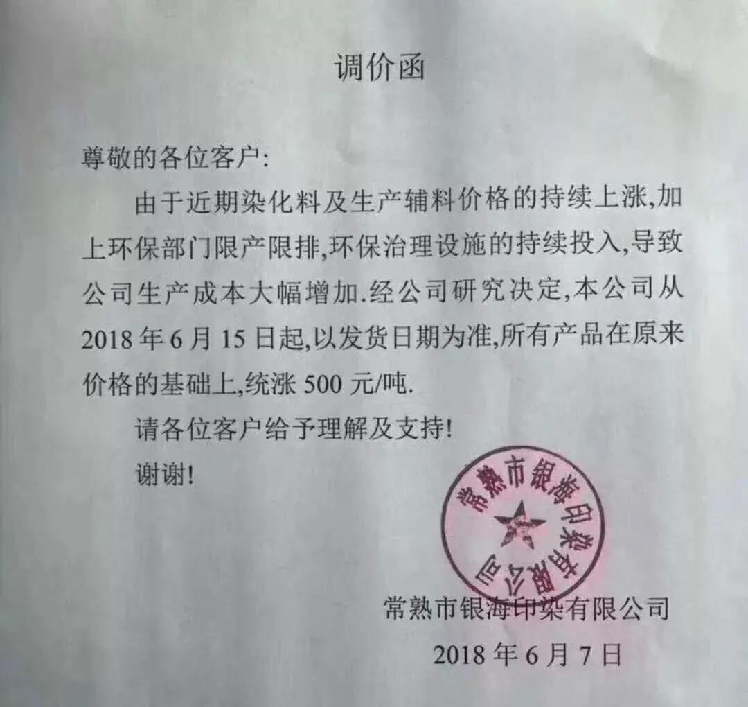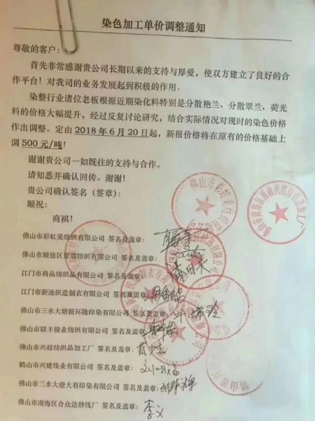 广东佛山、江门10家印染厂再次齐发涨价通知:6月20日起,新报价格将在原有的价格基础上调500元/吨。
