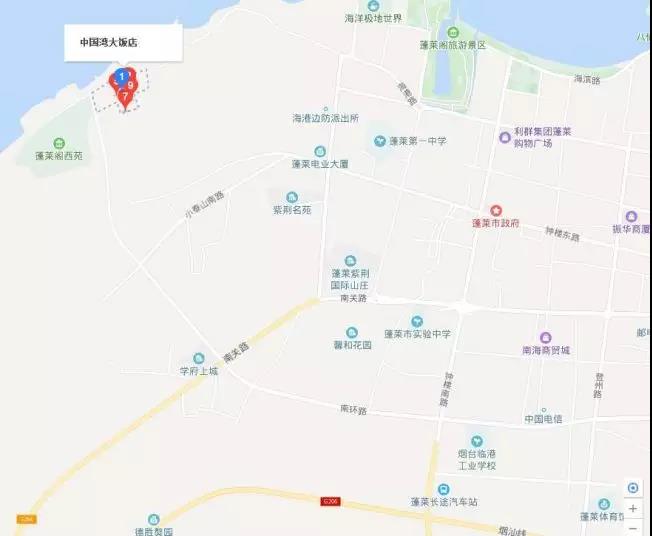 蓬莱汽车站:乘坐蓬莱8路至西庄站下车,步行至中国湾大酒店。打车约7公里,约18元。
