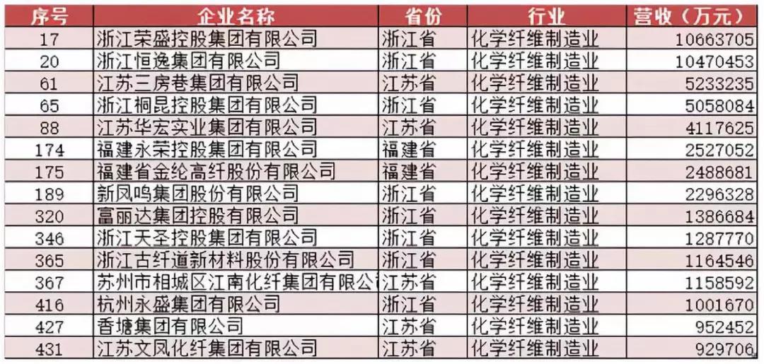 其中化学纤维制造业共有15家企业,总营收达50736583万元。前2家企业占该行业总营收的41.7%。化学纤维制造业入榜企业只在三个省有分布,分别是浙江省8家、江苏省5家和福建省2家,期中浙江省在该行业入榜企业总营收占比为65.7%。