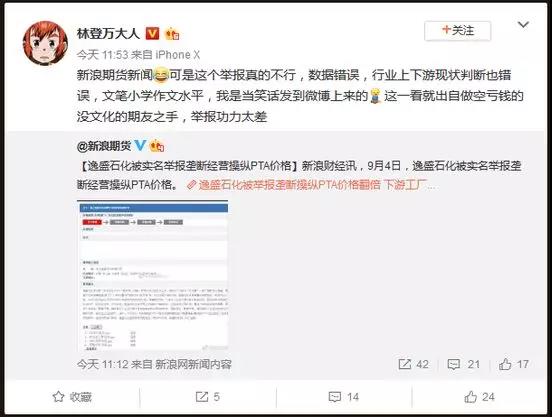微博大V“林登万大人”评论,可是这个举报真的不行,数据错误,行业上下游现状判断也错误,文笔小学作文水平,我是当笑话发到微博上来的这一看就出自做空亏钱的没文化的期友之手,举报功力太差。
