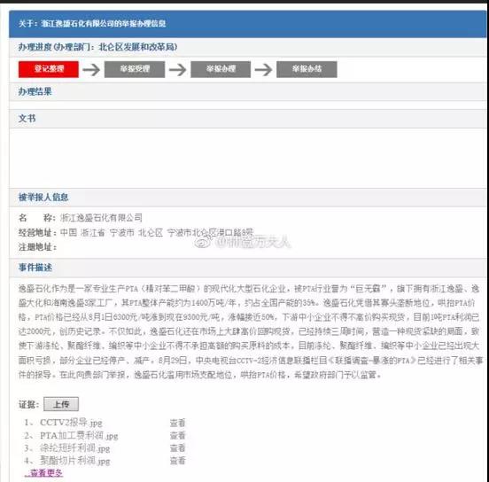8月29日,中央电视台cCrV-2经济信息联播栏目《联播调查暴涨的PTA》已经进行了相关事件的报导。在此向贵部岸报,逸盛石化滥用市场支配地位,哄抬PA价格,希望政府部门子以监管。