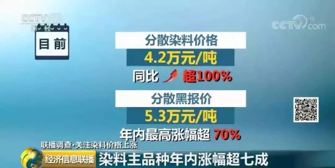 染料的主要品种有分散染料和活性染料,分散染料主要用于涤纶等纺织物,活性染料则用于棉麻。根据央视统计数据称,目前分散染料为每吨4.2万元,价格同比上涨超过百分之百,主要的染料品种分散黑的报价甚至一度涨到每吨5.3万元,年内最高涨幅超过70%,活性染料每吨3.3万元,同比上涨超过40%。