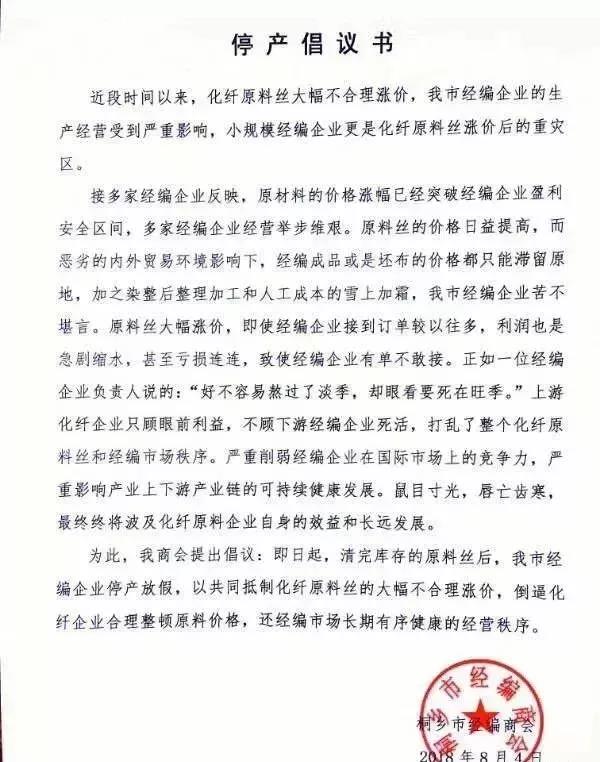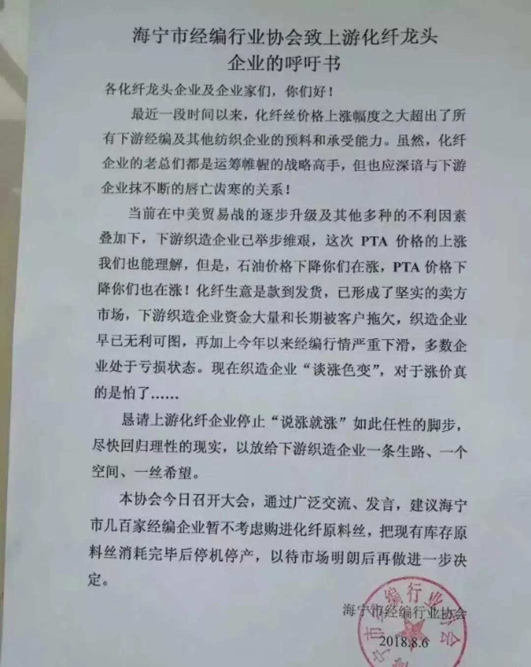 8月6日海宁市经编行业协会,致上游化纤龙头企业的呼吁书