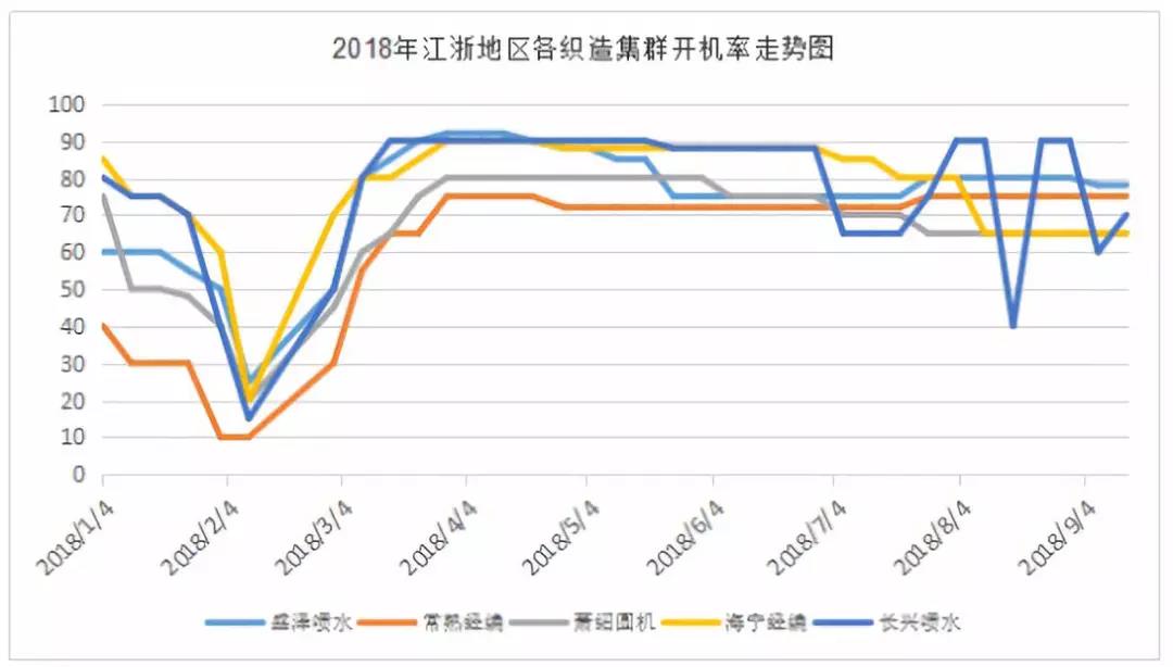 据了解,今年8月份以来,全国各地遭高温天气,加之原料频繁上涨,织造厂加工费受到压缩,市场开机水平出现下滑,其中海宁、长兴一带织造企业停机现象较为明显。从织造端来看,进入9月以后,市场开始出现走弱的迹象,尤其是盛泽等地,整个下游织造市场已经没有像7、8月份的情况。在市场交投气氛走弱,面料价格难以拉涨,而原料成本持续处于高位的背景下,织造厂家的生产积极性明显下降。据统计,从上周末至今,江浙地区开机运行情况还是发生了微妙的变化。