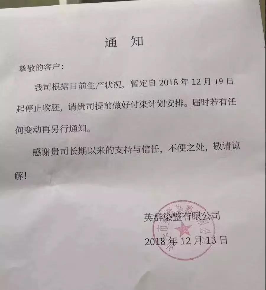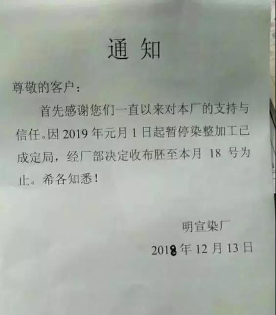 同日,某织染厂亦发布通知,决定即日起到2018年12月19日止停收胚布,具体通知如下: