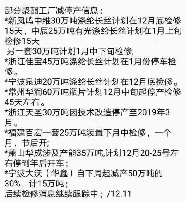 不光印染织造继而连三地发布一系列通知停产提前放假,聚酯工厂也是减产检修消息不断。