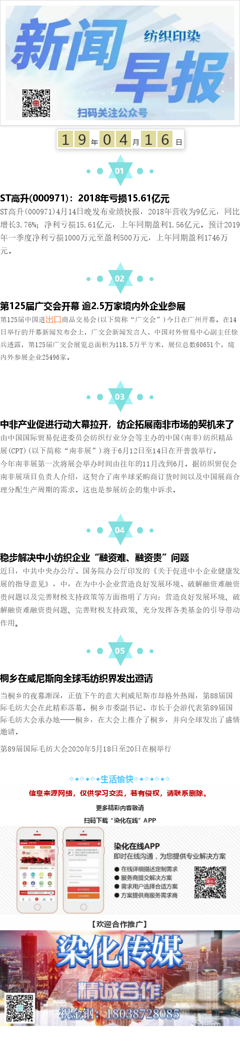 关键字:纺织、印染、简报点击:35354 发表时间:2019-04-16