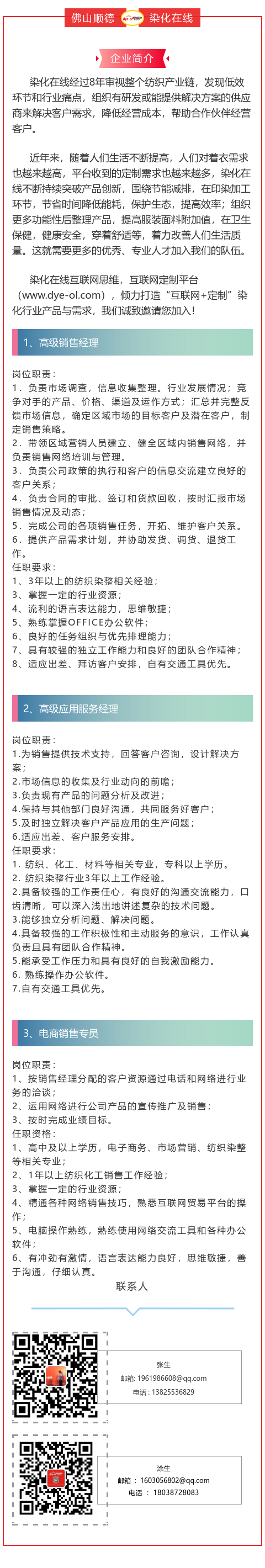 要求:专科以上学历,有染整经验5年以上,具备一定染整技术基础;或者染整纺织助剂销售经验5年以上;具备英语交流能力,熟练使用办公软件;待遇从优面谈;