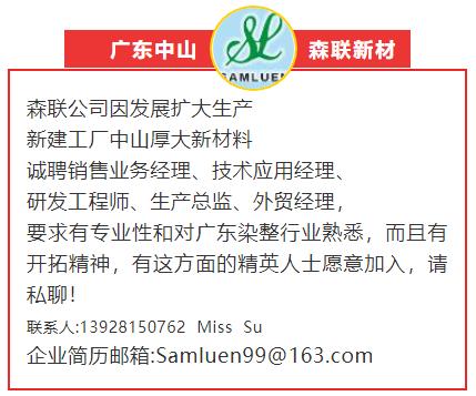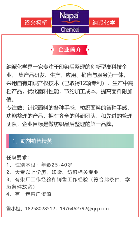 要求:专科以上学历,有染整经验3年以上,或者化学品销售经验5年以上;具备开拓市场之潜力;熟练使用办公软件;每年往返五次,待遇从优面谈;