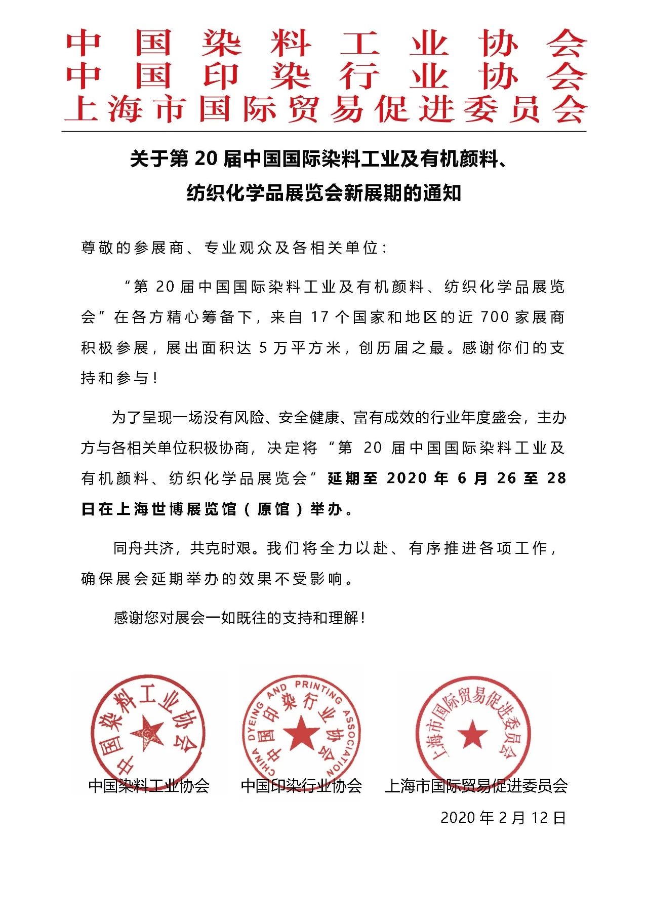 关于第20届中国国际染料工业及有机颜料,纺织化学品展览会新展期通知