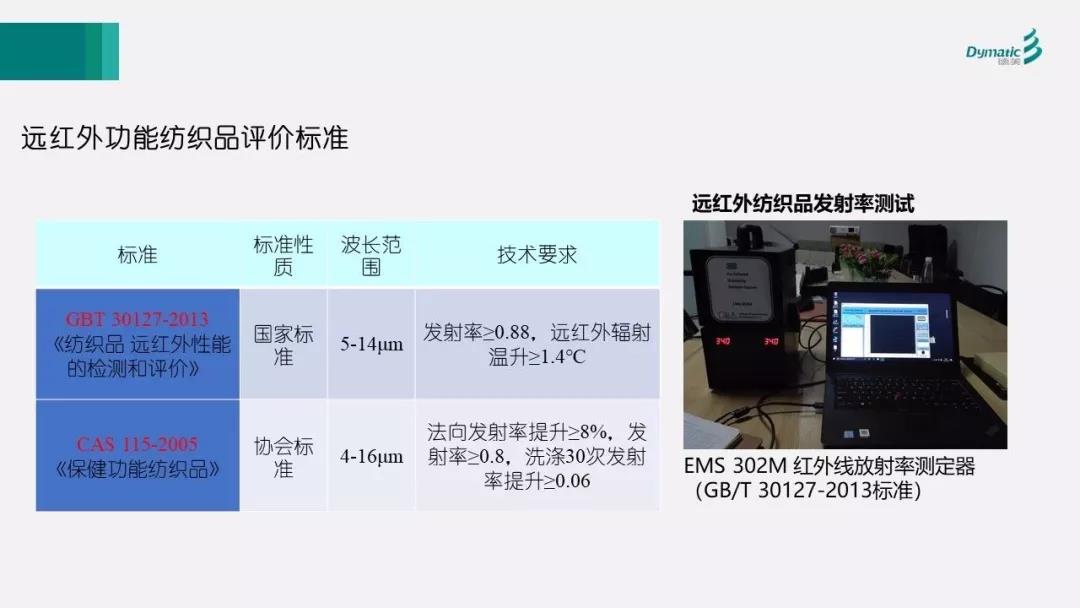 根据GB/T 30127-2013《纺织品远红外性能的检测和评价》标准:对于一般的纺织品,远红外发射率不低于0.88且远红外辐射温升不低于1.4 ℃的,才可被称为远红外纺织品;对于絮片类、非织造类、起毛绒类等疏松产品,远红外发射率不低于0.83且远红外辐射温升不低于1.7℃的,才可被认为该产品具有远红外性能。远红外纺织品按其功能可分为三类:保温用纺织品、保健用纺织品和卫生用纺织品。