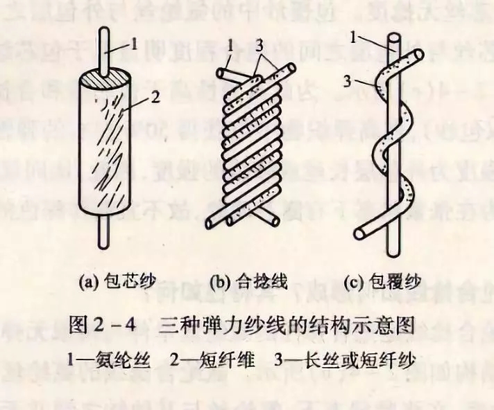 氨纶弹力纤维与其他纤维混合纺成弹力纱,其纱线的形式目前有三种形式:即氨纶包芯纱、氨纶合捻纱和氨纶包覆纱。三种形式的纱线在加工原理、结构性能上有着本质的区别。因此其用途和织造性能也有很大的差别。三种纱线的结构示意图如图所示。