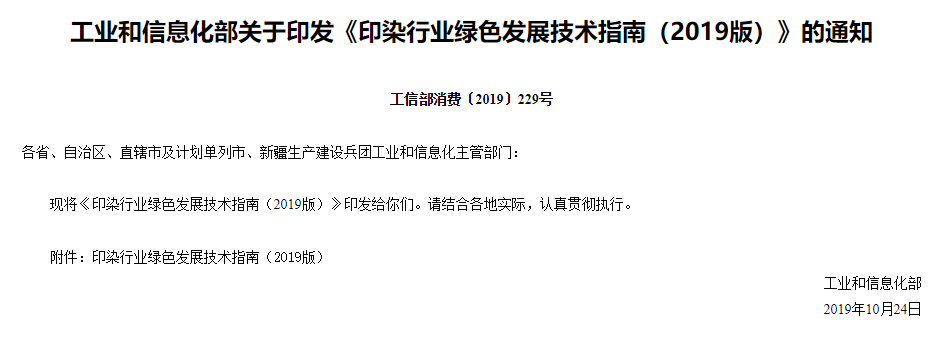 日,工信部发布《印染行业绿色发展技术指南(2019版)》,涉及定型机废气、印染废水等污染物处理与资源综合利用技术。