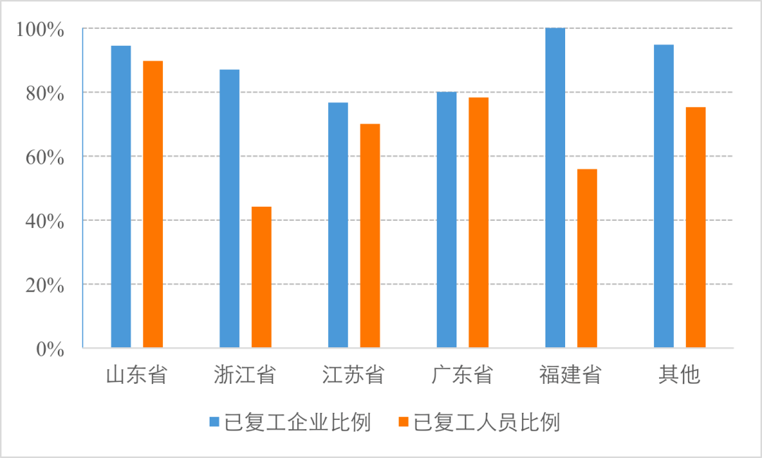 在参与调研的127家企业中,超8成企业分布在山东省、浙江省、江苏省、福建省和广东省等东部沿海地区,仅有14.96%的企业分布在中西部地区。统计结果显示,参与调研的企业中, 山东省印染企业复工复产情况相对较好,企业复工率和员工到岗率均超过85%,其原因是: 山东省多数企业以本地职工为主,工人返岗受阻情况不突出;浙江省和福建省的企业复工率虽然较高,但企业员工到岗率相对较低,返岗工人未完全到位成为影响企业复产进度的主要原因之一。