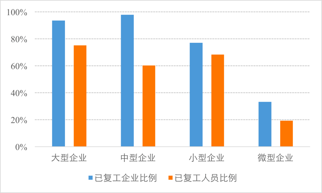 参与调研的127家企业以中小型企业为主,占比为72.23%,微型企业较少,占比不足3%。统计结果表明, 大中型企业的复工比例明显高于小微企业,大型、中型企业的复工率均达到90%以上,分别高于小型企业16.47和20.70个百分点;相较于较高的企业复工率,中型企业员工到岗率稍显不足,这是因为, 除当地政府积极助力异地员工复岗,大型企业也有能力自己组织员工顺利复岗,而中型企业在这方面所做的工作相对不够充分。