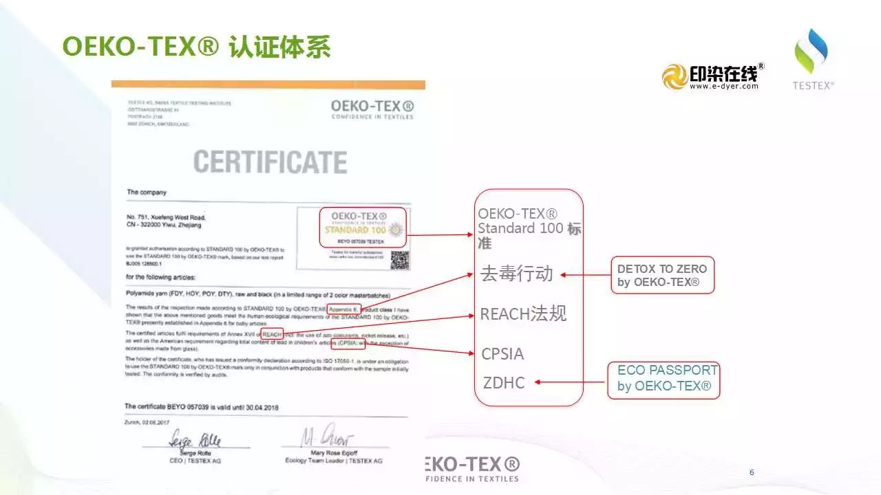 *2. 去毒行动:该证书上的产品通过了以STANDARD 100 by OEKO-TEX?附录6为标准的测试,附录6是专门为响应去毒行动而制定的有害物质与限量值要求