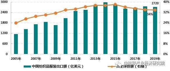 中国纺织行业在国际出口市场保持了稳定的规模优势,在全球出口总额中所占份额仅轻微下降。根据WTO数据, 2019年我国共计出口纺织品服装2720亿美元,占同期全球出口纺织品服装金额34%,较2018年34.2%的份额微降0.2个百分点。我国纺织品出口竞争力有所提升,2019年出口额为1200亿美元,占全球纺织品出口金额的39.2%,较2018年提升1.3个百分点,反映出我国纺织面料、化纤等产品在国际供应链中作用提升。2019年我国服装出口额为1520亿美元,占全球服装出口金额的30.8%,较2018年下降1.1个百分点。