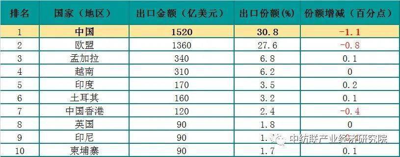 印度纺织品服装出口位次和总体出口份额与2018年相比保持不变。