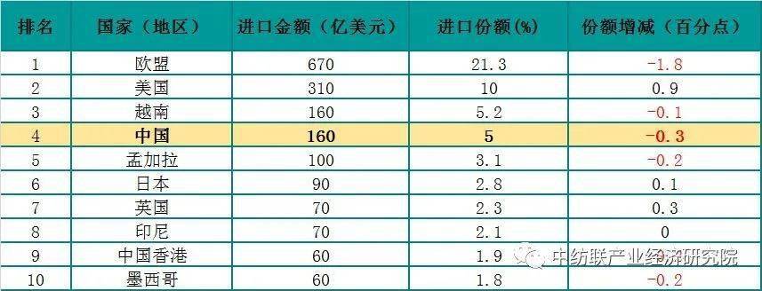 从纺织品和服装进出口前10位的国家和地区来看,各主要进出口国家及地区位次变化不大。 越南、孟加拉、土耳其出口市场份额保持提升态势。美国进口份额提升,欧盟进口份额下降。