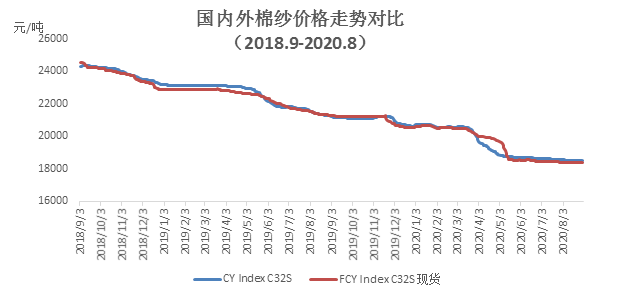本月内外棉纱价格均有所下降。国产32支纯棉纱8月均价为18512元/吨,较上月下降81元/吨,跌幅0.44%,较去年同期下跌2872元/吨,跌幅13.43%;进口32支纯棉纱月均价为18371元/吨,较上月下降74元/吨,跌幅0.4%,较去年同期下跌3013元/吨,跌幅14.1%。