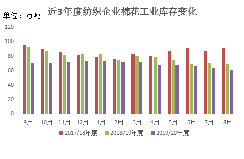 8月,下游市场需求虽有好转,但持续性不明显,纺织企业原料依然维持低库存,随用随买降低库存压力。截至8月30日,纺织企业棉花库存量为60.56万吨,较上月底下降2.39万吨,同比减少8.17万吨。其中:38%的企业减少棉花库存,22%增加库存,40%基本保持不变。