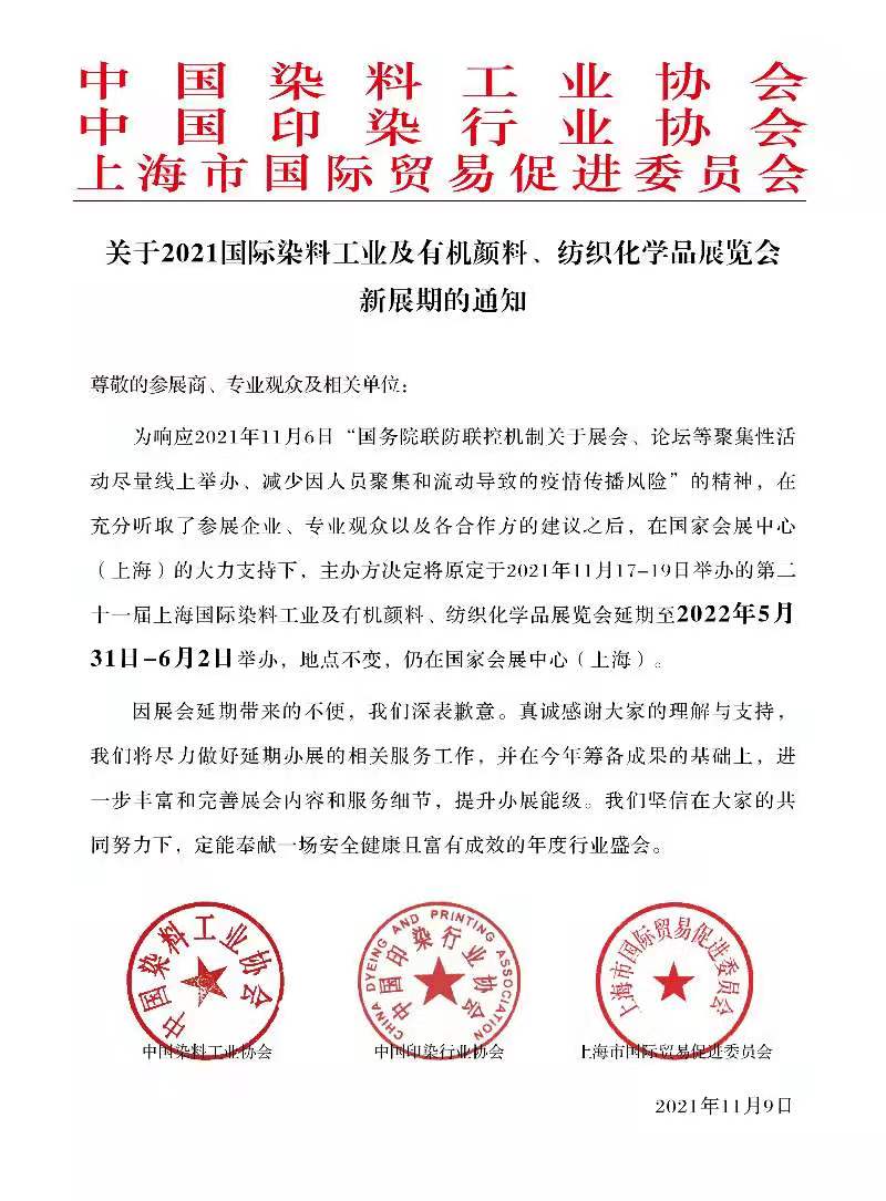 上海染化料展,新展期已确定,2022年5月31日-6月2日,还是在国家会展中心(上海)!