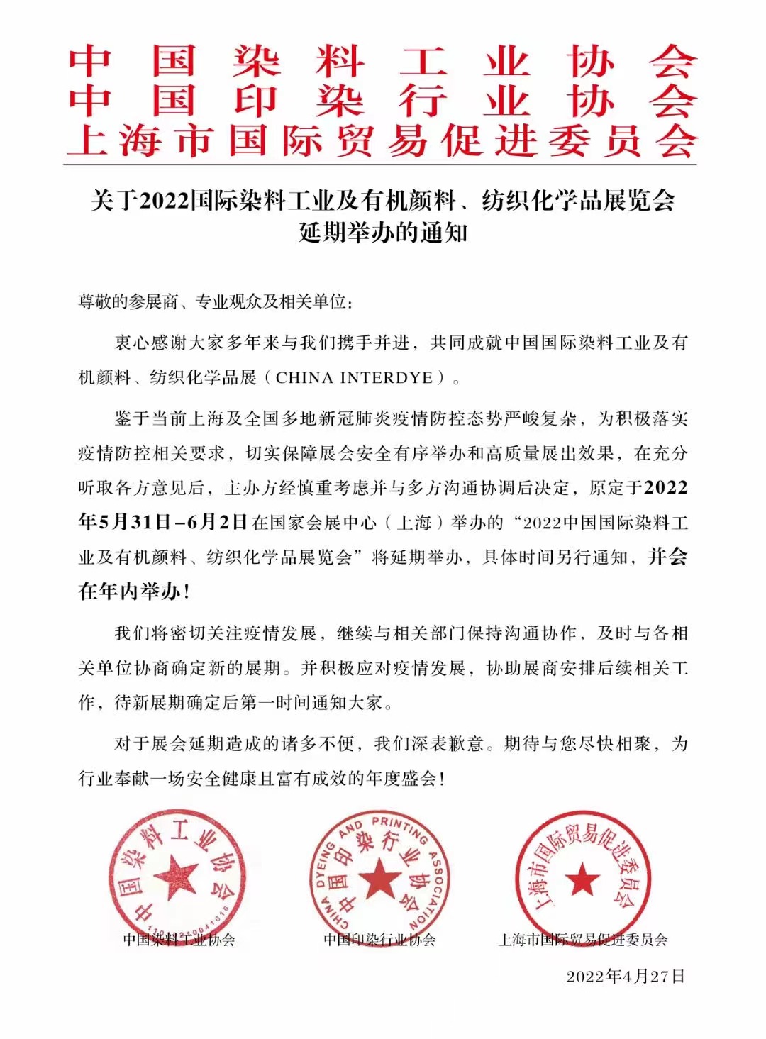 关于2022国际染料工业及有机颜料、纺织化学品展览会延期举办的通知