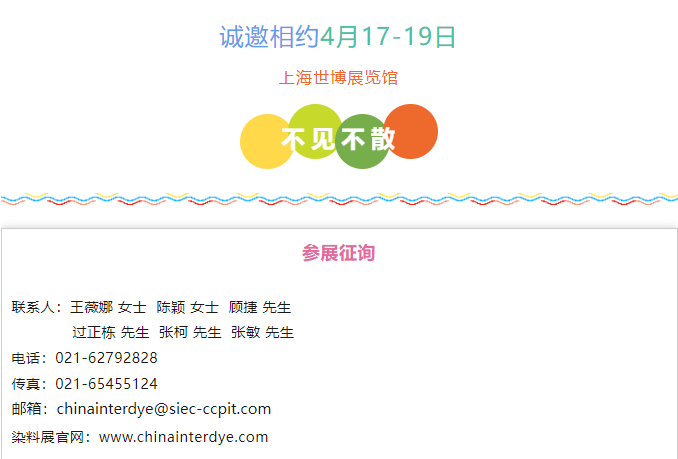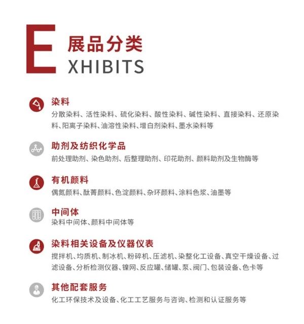 展会经过23年培育,已成为全球具有影响力的染化专业展。展品涵盖各类先进的环保型染料、有机颜料、助剂、中间体、仪器环保设备、配套服务等。本展是首个获得国际博览联盟UFI认证的染化展,先后被评为中国长三角地区优质会展项目和上海市优秀展,已成为染化行业每年必打卡活动。