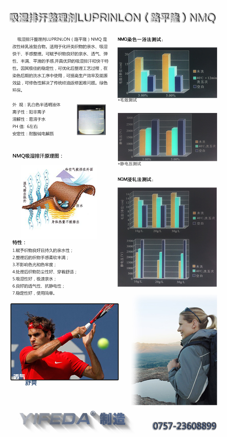 吸湿排汗整理剂LUPRINLON(路平隆)NMQ 是改性硅乳液复合物。适用于化纤类织物的亲水、吸湿快干、手感整理。可赋予织物良好的亲水、透气、弹性、丰满、平滑的手感,并具优异的吸湿排汗和快干特性。因其极佳的稳定性,可优化后整理工艺过程,在染色后期的洗水工序中使用,可提高生产效率及能源效益,可修色性解决了传统硅油返修困难问题。绿色环保。