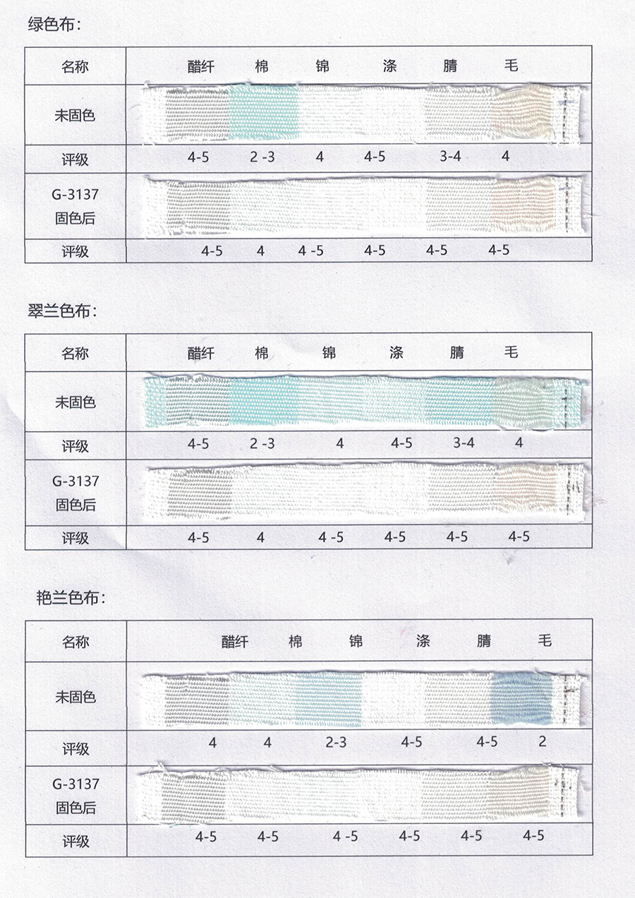 敏感色固色剂GRISEX格威赛斯®G-3137适用于棉、麻、毛、丝等织物进行染色或印花处理后的湿牢度提升处理。适用于活性染料、直接染料染色或印花后的固色工艺。亦可用于锦纶或锦棉双固中的阳离子固色。对棉、羊毛等织物的耐氯(盐素)牢度也有一定的提升性。本品不含偶氮、不含APEO等禁用物质,符合国标与欧美环保标准。