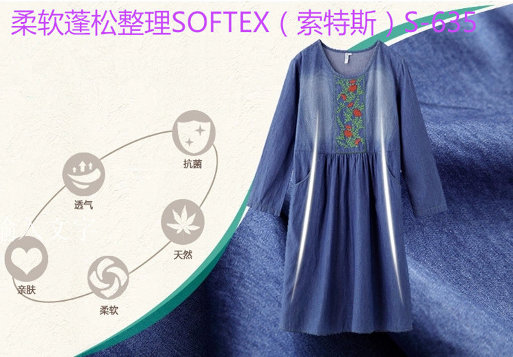 全棉牛仔/成衣定型用柔软蓬松整理SOFTEX(索特斯)S-635是新型的改性有机硅氧烷聚合物。适合棉类织物的柔软、蓬松整理,经整理的织物具有优异的柔软、蓬松风格,手感柔滑细腻,质感丰满。对棉类织物具有优异的亲和力,不含APEO等禁用物质,符合环保要求。