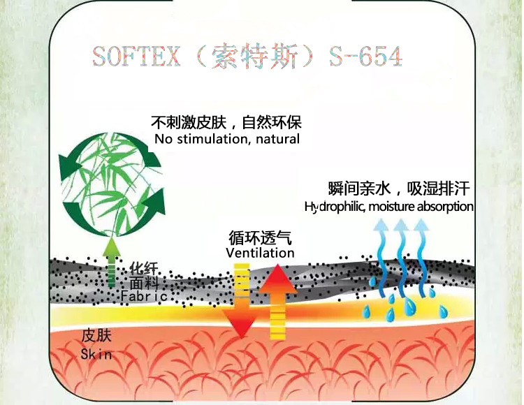 化纤亲水型超软滑硅油SOFTEX(索特斯)S-654通过对涤纶亲水性改性,从根本上解决了涤纶吸湿性差、手感粗糙、静电大、易玷污等一系列问题。由于化纤亲水型超软滑硅油SOFTEX(索特斯)S-654与涤纶的结合是非常牢固的,在一般洗涤条件下,他们不会脱落,因此具有优异的耐洗性能。