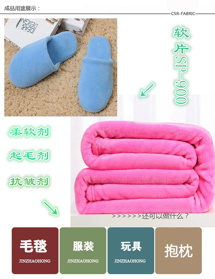 软片对棉、混纺T/C纱线有极好的柔软、蓬松、起毛手感。耐洗性极为优良,主要用作纤维的柔软蓬松剂起毛剂、柔软抗皱剂。