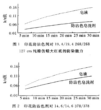 印花织物经蒸化后的色牢度及鲜艳度,很大程度取决于水洗皂洗的效果,而选择性能优良的皂洗剂,对防止白底沾污,提高鲜艳度尤为重要。由非离子表面活性剂,苯磺酸盐与其他助剂复配而成的皂洗剂,做一般活性印花的皂洗液尚可,但对于白底深色印花且要求白底较白的产品,如:双边深色仿腊花布,其白边及留白处沾色严重,影响产品质量。为此对于增加了具有分散、吸附、螯合、助洗、增白等作用的多功能螯合分散剂、三聚磷酸盐、CMC等成分的皂洗剂,突出提高其防沾色能力,使其既具有一定的净洗能力,又具有良好的防染能力,对提高产品的鲜艳度,防止白底污染,具有良好的作用。实验表明:加入印花防沾染剂的防沾污能力远远大于一般皂洗液的防沾污能力。结果见图1、图2,图中K/S值表示沾污程度,K/S值越小则表示织物受沾污越轻。