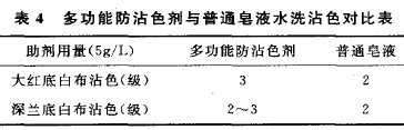 白布沾色实验:把同样大小的试样(19.4/19.4268/268127cm纯棉仿蜡大红底或14.6/14.6378/378137cm纯棉高密仿蜡深兰底各两块),一块放入盛有印花防沾色剂的烧杯中,一块放入盛有一般皂液的烧杯中,进行皂洗,其皂洗时间、温度一致,水洗烘干,做白布沾色试验,按GB/251—1995标准用评定沾色用灰色样卡评定,其白布沾色情况见表4