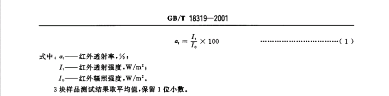 平面织物对人射的红外线在织物平面透射半球方向上射出的能量占人射能量的百分数。透射方向输出的能量包括经织物中各层纤维折射和散射在射出半球方向的所有能虽。