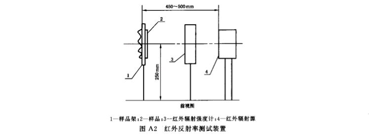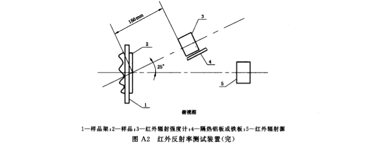 A2. 2 红外反射率测试装置各组件的相对位置见图A 2。样品左、 右、 后方及上方应有不小于 1. 5 m 的空间 , 下方应有不小 于 l m 的空间 。