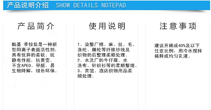 酯基季铵盐是一种新型 阳离子表面活性剂,具有优异的柔软、抗静电性能,抗黄变。不含APEO、 甲醛,易生物降解,绿色环保。用量少,效果好,配制方便,综合成本低,具有极高的性价比。