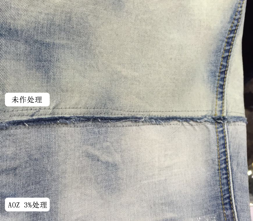 我们对同类抗臭氧柔软剂进行分析对比,发现抗臭氧柔软剂AOZ效果较好,其抗黄变原理是抗臭氧柔软剂先与臭氧发生反应,保护靛蓝染料不被破坏。